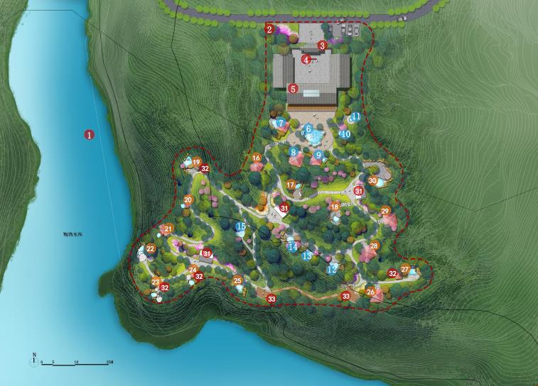 依托梅灣湖獨(dú)特的自然山水資源和豐富的生態(tài)基底,于半坡水岸、隱秘湖灣間塑造一個(gè)集旅游休閑度假、康體養(yǎng)老養(yǎng)生于一體的高端野奢溫泉度假區(qū)。